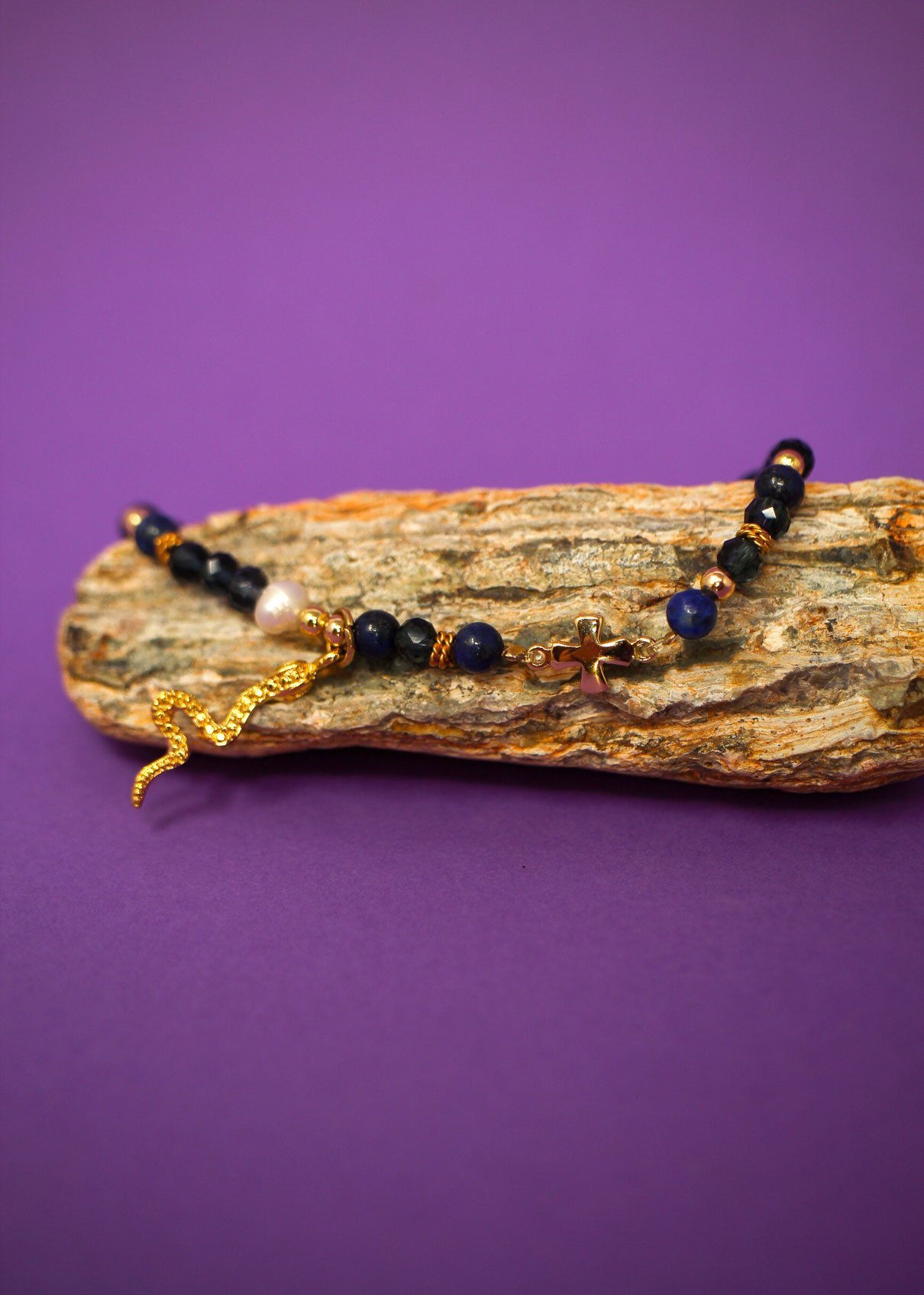 - Pulsera de Cuarzo Lapislázuli con Dije de Cruz y Serpiente de Chapa de Oro de 18K.